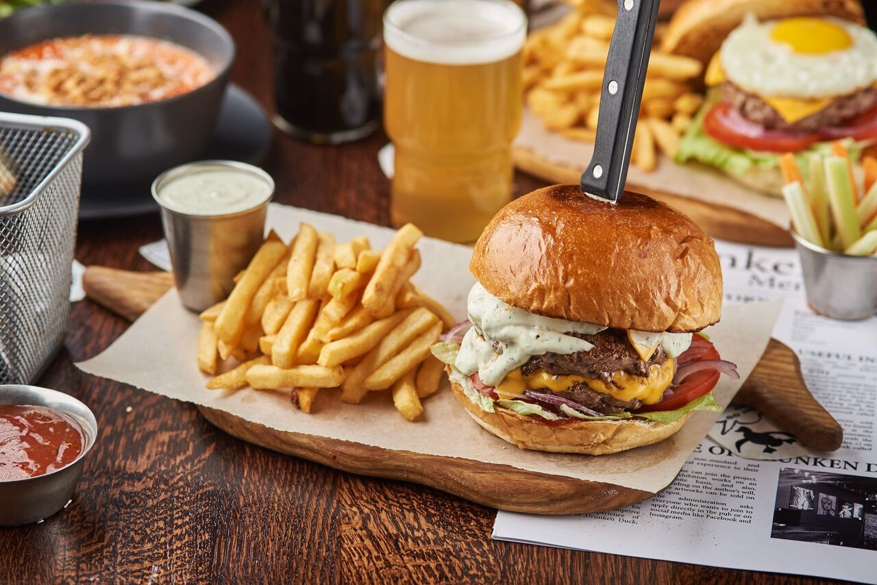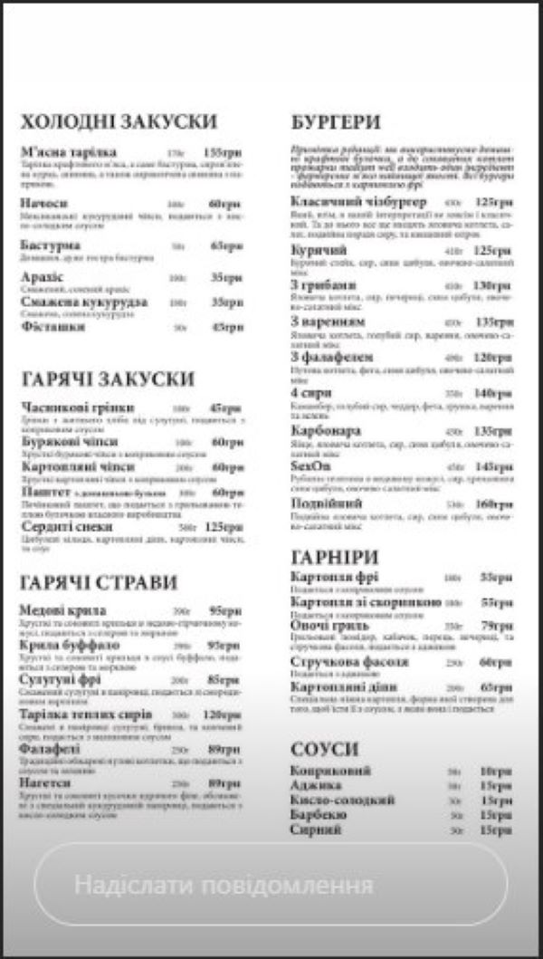 Наше широке меню включає в себе бургери, салати, стейки, холодні і гарячі страви, та десерти. Продукти використовуємо виключно свіжі та 100% якості. Стараємось інтегрувати крафтові традиції і в приготування наших страв, тому, на приклад, для бургерів використовуємо домашні булочки, які щоранку турботливо забираємо з пекарні.